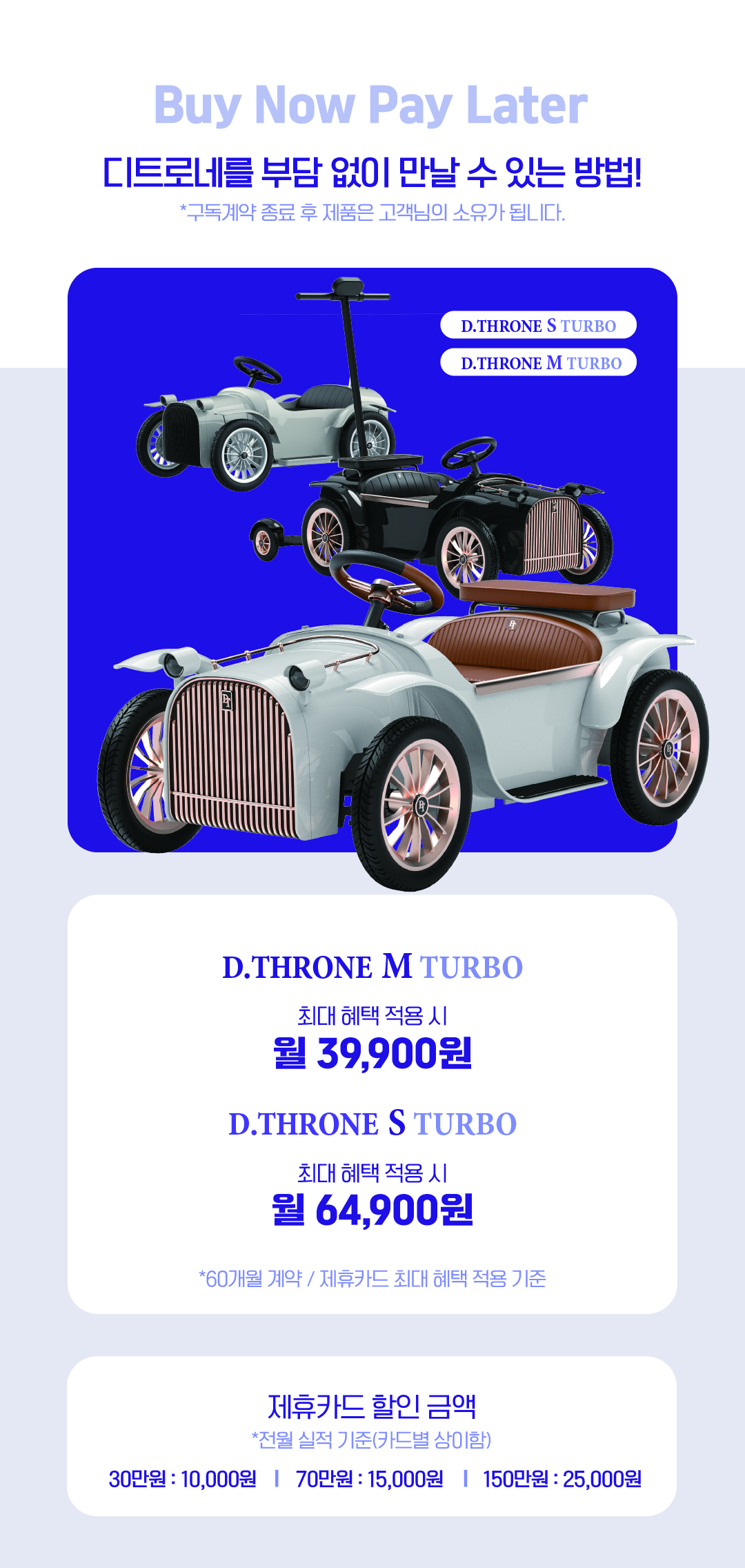 디트로네 장기렌탈은 할부처럼 매월 렌탈비를 납부하므로 고객님의 목돈 지출에 대한 부담을 줄여주고 디트로네를 경험할 수 있습니다. 매월 렌탈비를 결제할 카드를 지정하여, 자동이체 시스템으로 출금되는 할부와 유사한 결제수단으로 이해해주시면 됩니다.