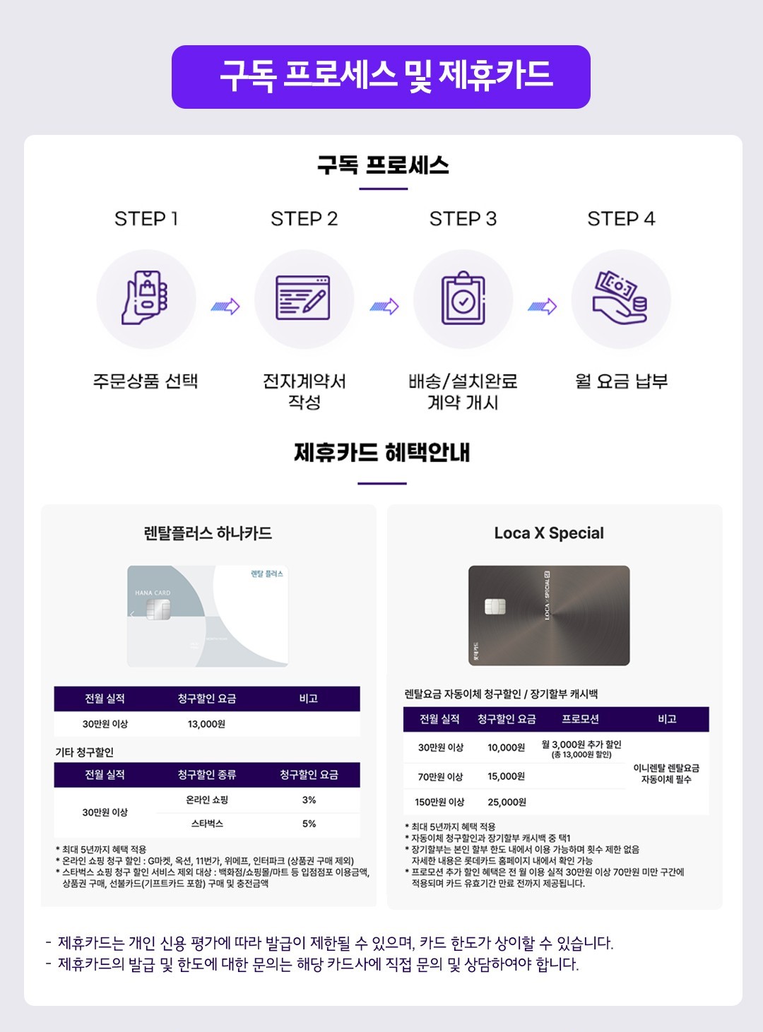 제휴카드 할인은 사용 실적에 따라 익월 렌탈비가 자동 청구 할인됩니다.